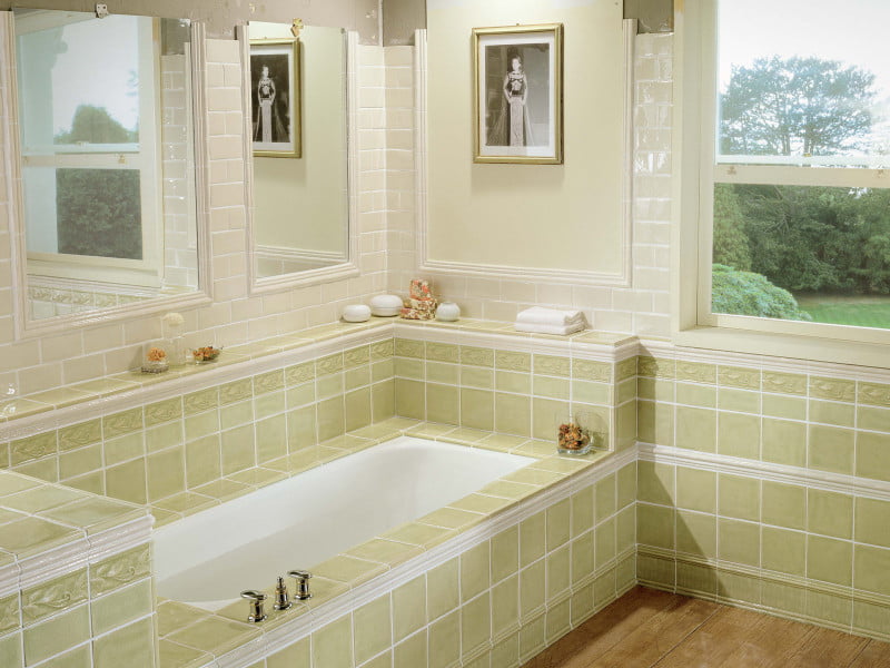 Отделка ванной может быть упрощена использованием специфически окрашенных досок, простой штукатурки или кирпичной кладки. Однако, в свете специфики “климата” оформляемого помещения, приоритет лучше оставить, за привычной нам сегодня в обиходе, керамической плиткой. Единственное, что нужно в этом случае предпринять – это найти модели с растительным орнаментом, соответствующим стилю. Не забывайте, что фон ванной должен быть светлым, поэтому выбирайте плитку голубых, бежево-розовых, нежно-песочных оттенков. Подойдут для создания базовой палитры цвета морской лагуны, луговых травок и солнечного тепла. Найти подобные варианты не проблематично, потому что производителям керамики сегодня не составляет труда выпускать продукцию во всевозможных цветовых решениях.