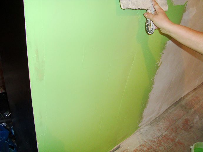 - Закругленными плавными движениями с помощью шпателя наносится слой штукатурки, с помощью последнего устраняются небольшие дефекты стеновой панели. Используется небольшое количество штукатурки, т.к. слой должен быть тонким.