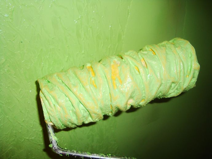 Валик окунается в микс и просто наносится на стену. Начните лучше со среднего слоя. Перед тем, как он полностью высохнет, можно сгладить поверхность с помощью шпателя, как упоминалось ранее. Опять же, шпатель нужно использовать под углом 5 градусов.