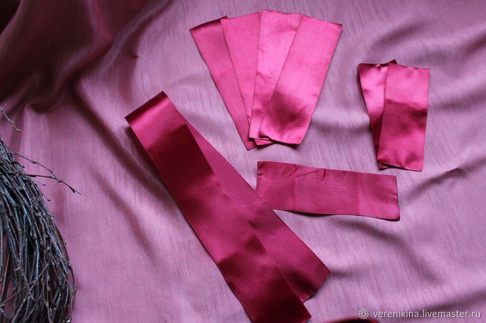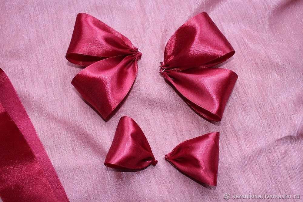 Пока высыхают шарики, можно изготовить бант. Для этого нам понадобятся 4 отреза ленты по 17 см, 2 отреза по 12, 1 отрез 15 см и 1 отрез примерно 60 см. Все края прошла зажигалкой, чтоб не стали распускаться.
