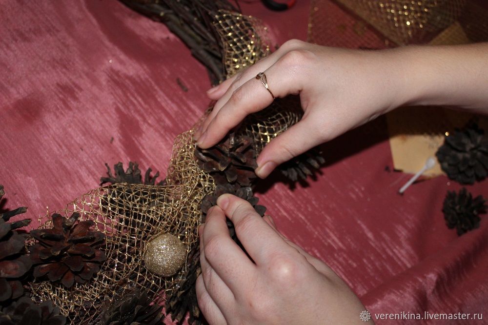 Наши шарики уже высохли, пока мы занимались бантом. теперь настало время украсить наш венок сеткой. Хаотично закрепляем с одной стороны и по верху клеим шишки и шарики.