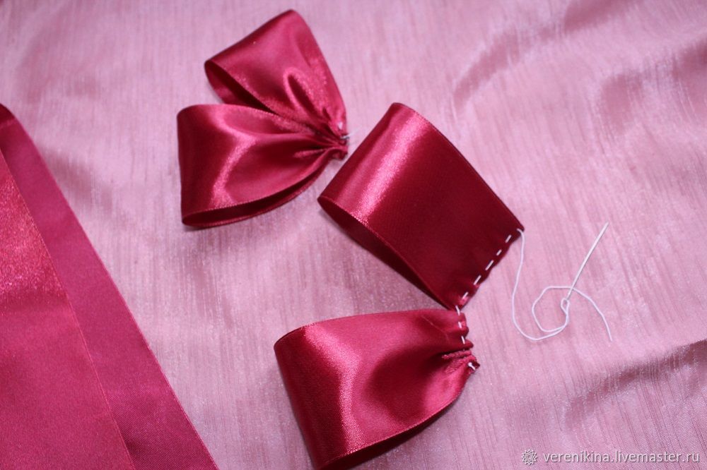 Здесь пригодится нам нитка с иголкой, собираем наши ленточки, как показано на фото ниже, и закрепляем. Не стала использовать здесь горячий пистолет (хоть и можно), как мне кажется, иголкой намного проще.