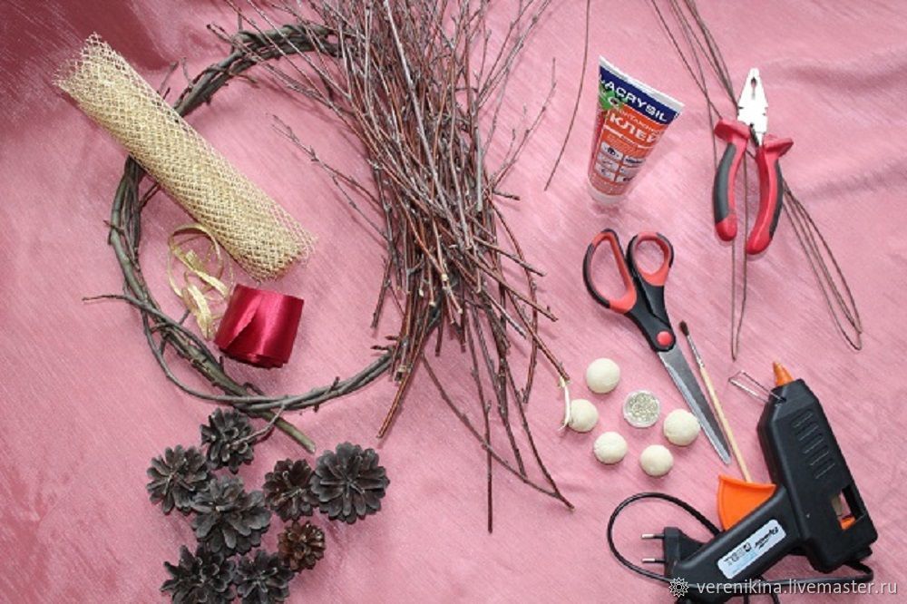 Подготовив все необходимые элементы, начнем создавать венок из веток своими руками. Мастер-класс поможет в этом.
