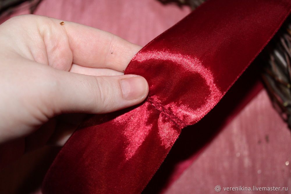 Саму ленту, на которой и должен висеть венок, закрепляем на машинки внахлест, как показано на фото.