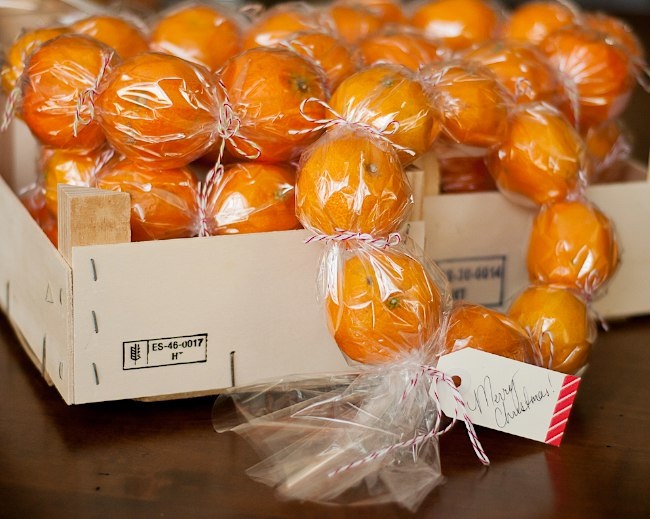 Если вы собираетесь в гости, то в качестве подарка можно использовать «голенькие» мандаринки без кожуры. Аккуратно упаковываем плоды в прозрачную пленку, после чего украшаем подарок яркой лентой:
