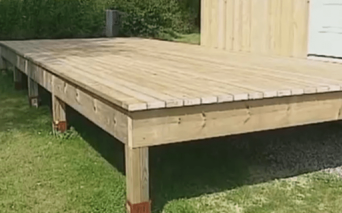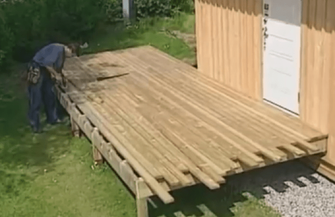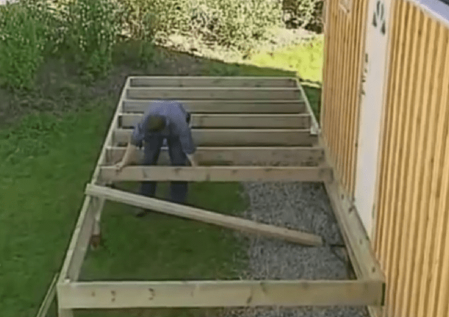 Брус. Располагается между горизонтальными балками, как правило, на расстоянии 16 или 24 см. друг от друга. Они распределяют вес веранды, позволяя правильно использовать доски настила.