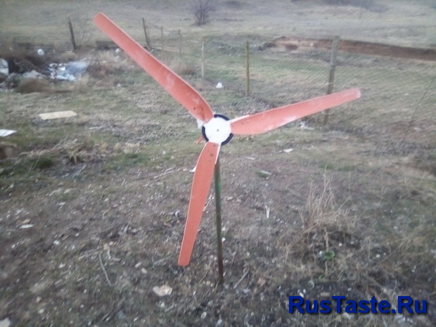 Общий вид ветряка. Как видно по итогу укоротил хвост в два раза, а лопасть хвоста увеличил в полтора раза и ветряк нормально сбалансирован