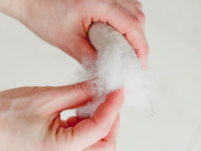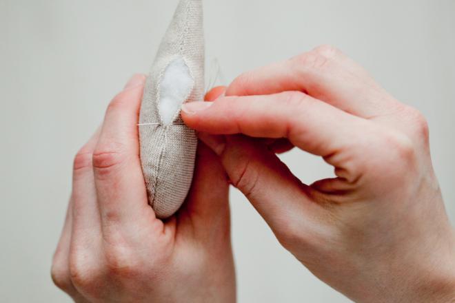 16. С помощью ножниц аккуратно делаем отверстие на спинке голубя и пропускаем через него атласную ленточку и завязываем узел. Лишнее отрезаем ножницами.