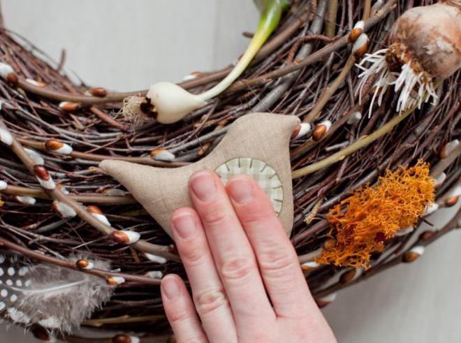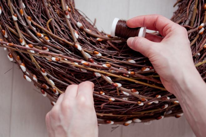 Для начала сплетите плотный круг из обыкновенных веток. Зафиксируйте ветки плотной ниткой в цвет веткам. Теперь украсьте круг из веток букетами из вербы.