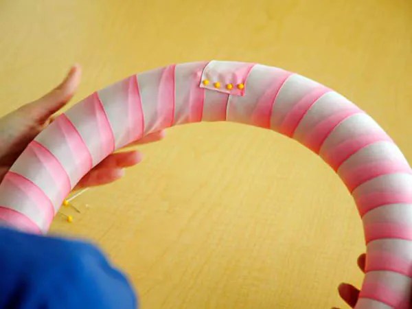 Красивыми тканевыми складками задрапируйте основу для венка и вот уже современный и оригинальный предмет интерьера готов.