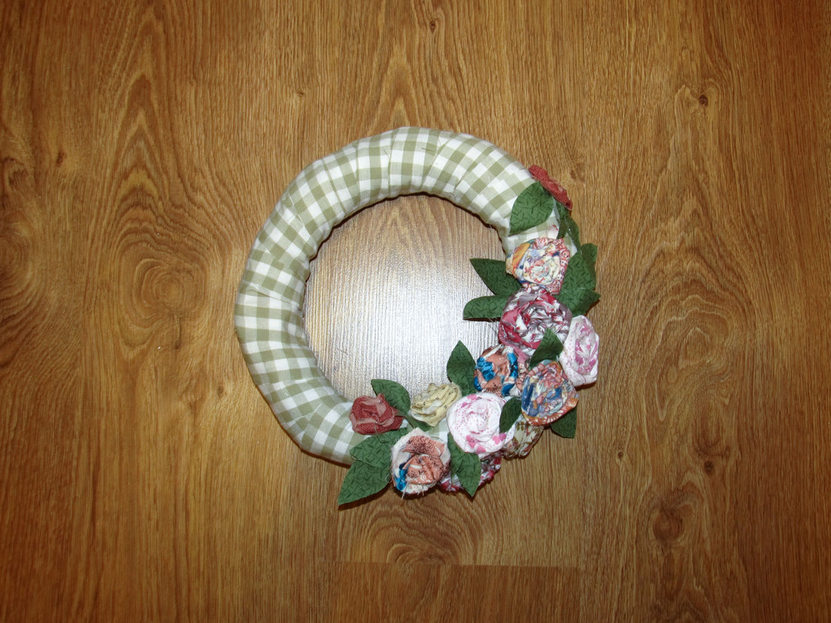 Чтобы сделать вот такой весенний венок, вам понадобиться лишь основа для венка и небольшой отрезок ткани.