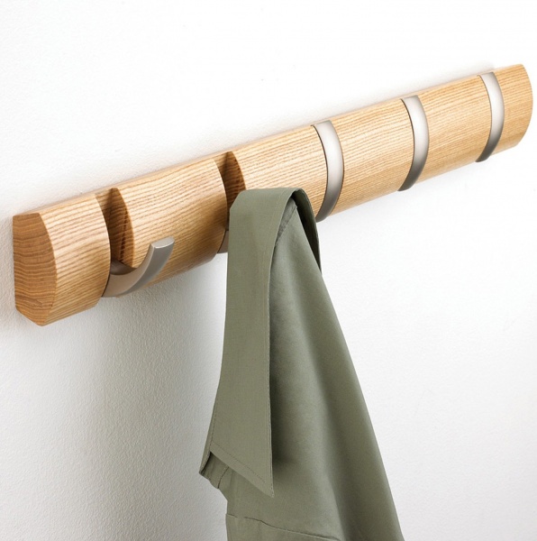 Интересный вариант комбинирования двух материалов: дерева и металла. Современная компактная вешалка с встроенными крючками.