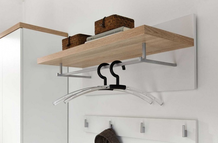 Не всегда на вешалку есть возможность и желание устанавливать крючки. В этом случае можно смонтировать металлическую или деревянную штангу. Важно помнить, что, если планка будет слишком длинной, то необходимо обязательно установить перемычку в центре.