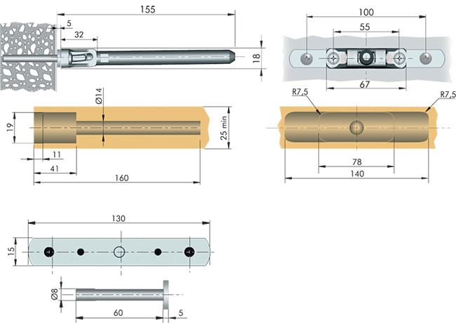 - При монтаже на скрытые анкерные стержни (так называемые титаны) вставьте их в отверстия, просверленные в стене, и затяните ключом. В торце полочки сделайте ответные отверстия нужной глубины и наденьте ее на титаны.