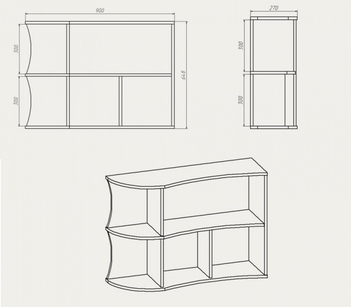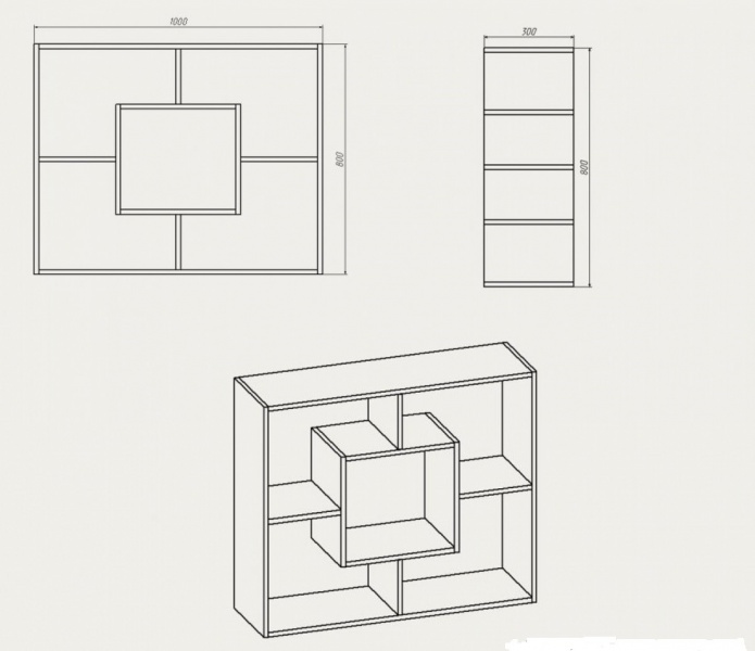 - Классические навесные, устанавливаемые на свободном участке стены. Чаще всего предназначены для хранения книг, поэтому делаются прямоугольной формы. Но ничто не мешает вам проявить фантазию и придать изделию необычный вид, сделав его квадратным, круглым или состоящим из нескольких частей, как это показано ниже на чертеже.