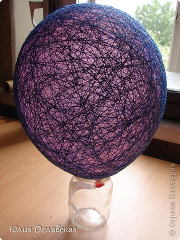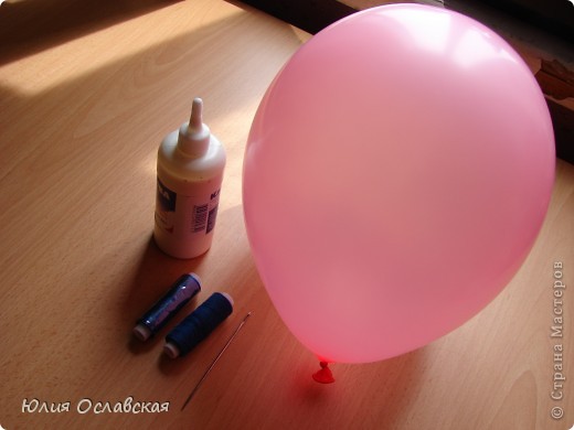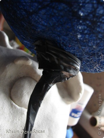 Нам понадобится: для шарика — Клей ПВА, большая игла, 3 катушки ниток, воздушный шарик, маленькая лампочка, патрон под нее, провод, вилка, проволока и изолента черного цвета.