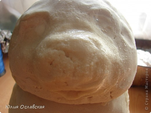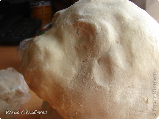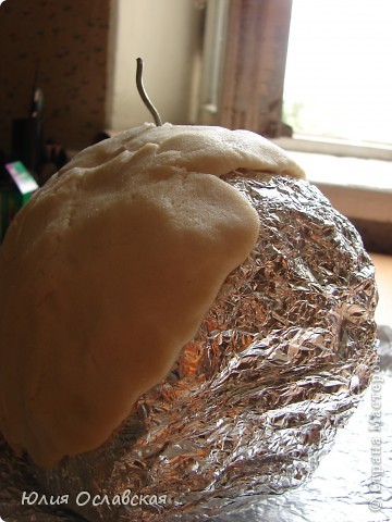 2) Из полученной массы формируем круглую пластинку небольшой толщины, смазываем водой и оборачиваем вокруг пластикового яйца.