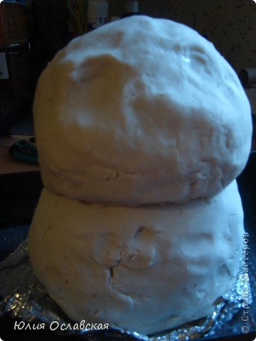 4) Ставим заготовку из пластикового яйца на основу. Снизу крепим два шарика, которые будут ножками Винни пуха. Делаем пальчики, используя стеку.