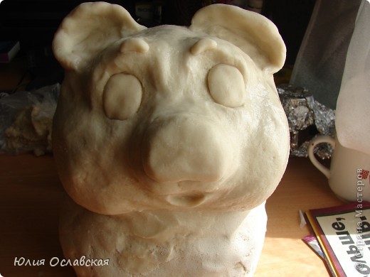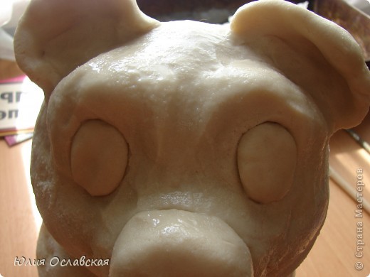 6) Далее формируем мордочку и ушки, приклеив их затем на нужные места. Вырезаем ротик, делаем также маленькие шарики, которые будут носом и глазками. Прикрепляем все детали, не забывая использовать воду.