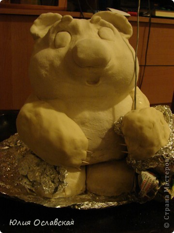 Для Пуха нам понадобится: газета, фольга, зубочистки, тесто, краска гуашь и лак.
