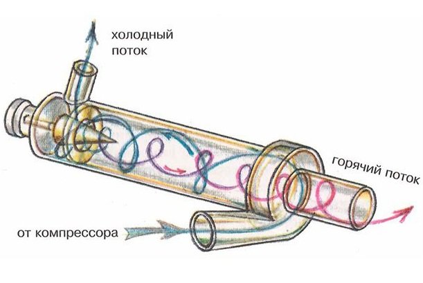 Показанный на схеме принцип работы вихревой трубы несложен — поток проходит через камеру закрутки, где разбивается на два потока с разной температурой