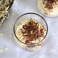 - Возьмите красивый, пузатый, объемный стакан. На его дно выложите печенье, затем пропитайте ромом и эспрессо. Выложите небольшое количество крема.