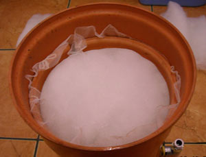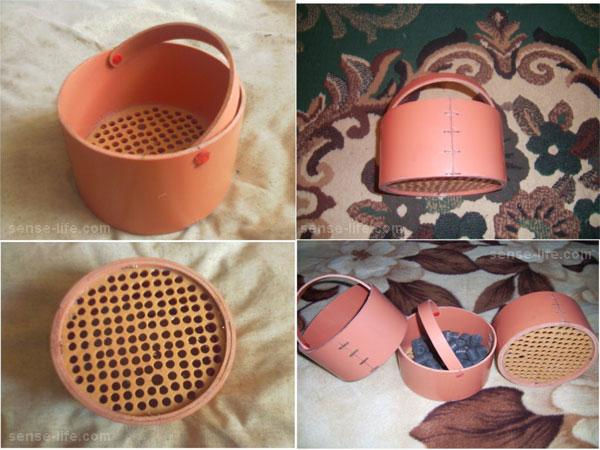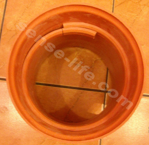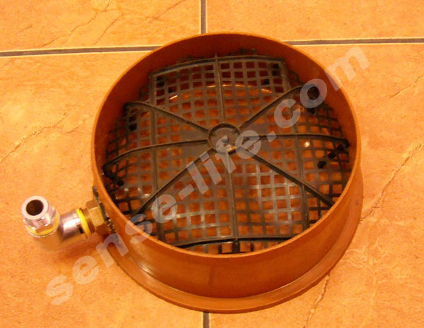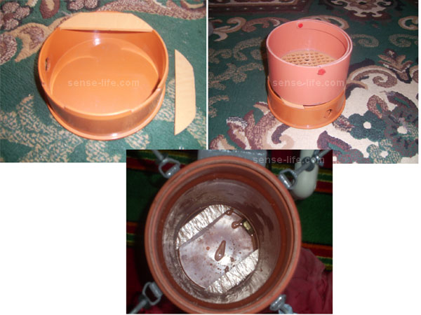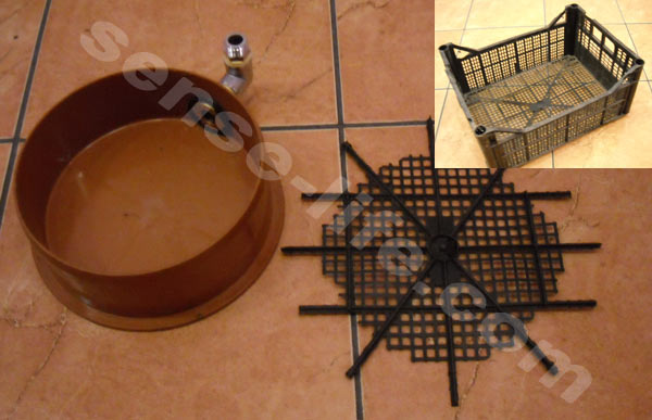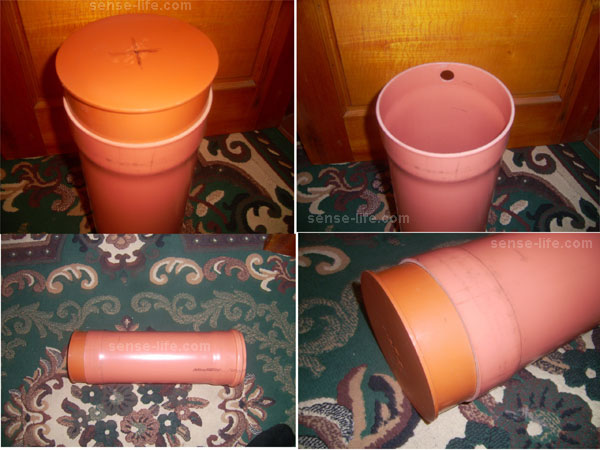 - Чтобы организоованное на данном этапе входной отверстие (в нижней части трубы) для поступления воды всегда было свободным, можно сделать для него колпак с маленькими отверстиями (из пластиковой бутылки), поверх которого закрепить своеобразную сетку с отверстиями (из CD-диска).