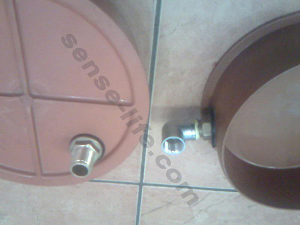 - В нижней и верхней частях трубследует проделать отверстия, в которые будут вкручиваться штуцеры. Резьбы последних следует предварительно обмотать лентой-герметиком. Внутри труб штуцеры необходимо зафиксировать гайками.