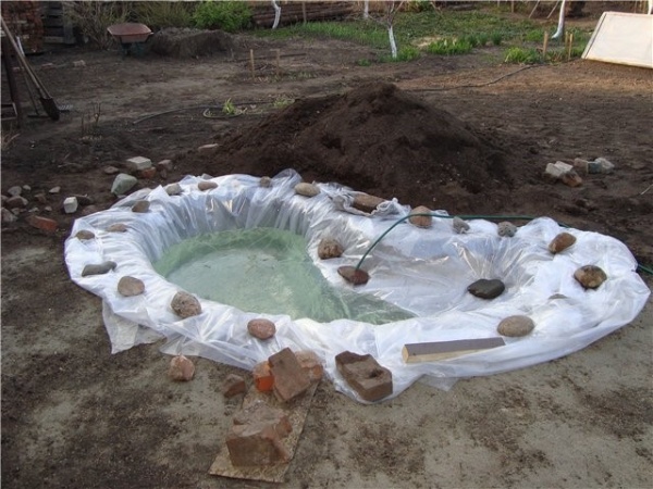 Первый этап — рытье котлована и выравнивание стенок. После того, ка требуемая форма и размеры достигнуты, горизонтальные площадки ровняются и засыпаются слоем песка. Он будет предохранять пленку от возможных повреждений.