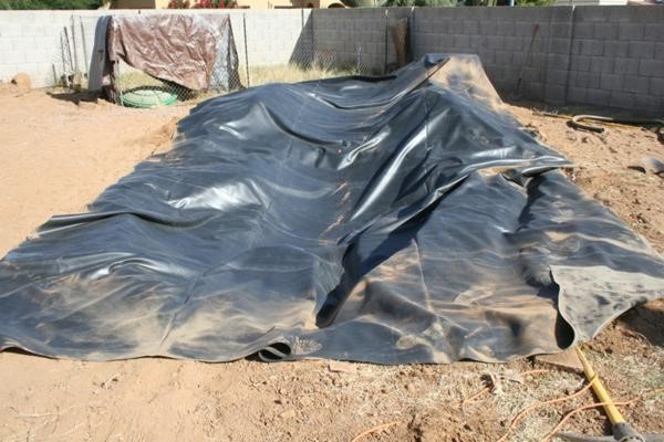В готовый котлован укладываем пленку. Внутри она должна лежать без натяжения, свободно. Ее края засыпают грунтом, прижимаются валунами. Чтобы предотвратить прорастание корней растений через пленку, под не желательно расстелить . Это нетканое полотно, очень прочное на разрыв. Его используют при прокладке автодорог, чтобы не раздавливался грунт и не прорастали деревья. Так что фонтан она защити без труда.