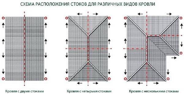 ![]() | В законченном виде кровля с установленной по карнизу и стенам водосточной системой должна работать так, как представлено на данном рисунке. Стрелками, нанесенными на крышу, показан правильный сток воды, а указатели, располагающиеся вдоль желоба, демонстрируют направление потоков в желобе в сторону водосточной воронки. |