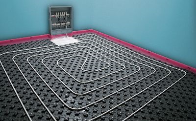 Принцип устройства подогреваемого водой пола следующий: к отопительному котлу или системе центрального отопления подключаются трубопроводы, по которым горячая вода подается в систему уложенных спиралями по перекрытиям труб