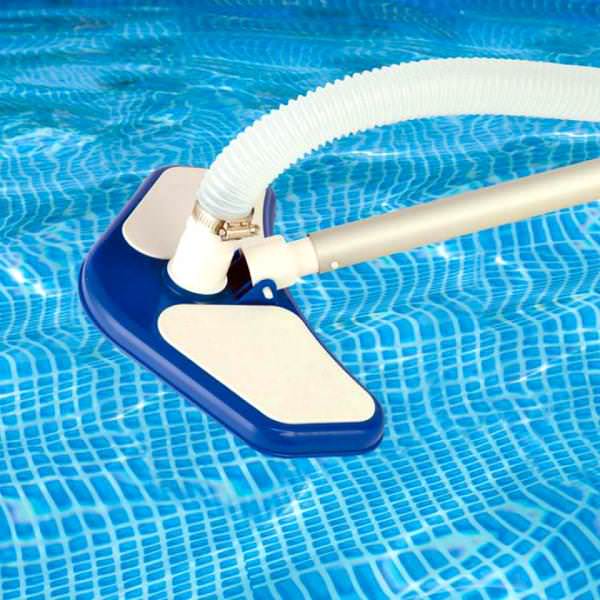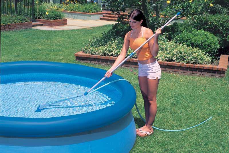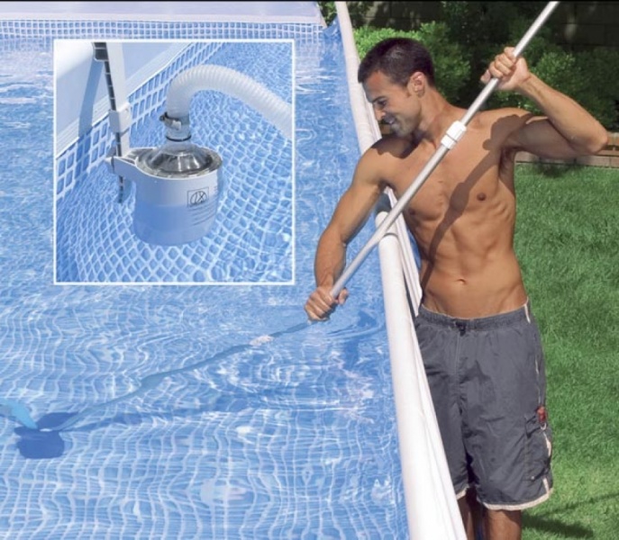 Когда загрязнения, снятые со стенок каркасного резервуара, полностью осядут, можно будет приступать к уборке бассейна пылесосом. Проводят процедуру так: