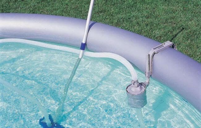 Если бассейн расположен под укрытием, листья и трава в него не попадает. Для удаления ила собирают пылесос упрощенной конструкции. Из материалов понадобится щетка от обычного аппарата для всасывания пыли, гофрированный шланг, насос, а также кусок полипропиленовой трубы длиной 1 м.