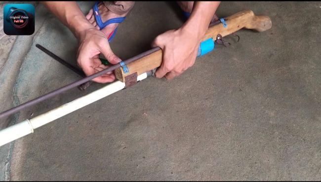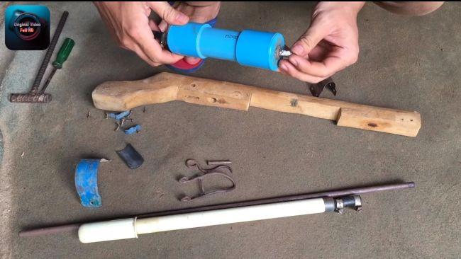 Все элементы этого самодельного оружия были сделаны предварительно, тут только показано, как происходит сборка пневматики. Цилиндр представлен в виде куска трубки из ПВХ, где находятся заглушки. Закреплять последние необходимо прочно и клея иногда не хватает, лучше всего их еще прикрутить саморезами. В этом случае самое важное, чтобы цилиндр был герметичным и мог удержать высокое давление.