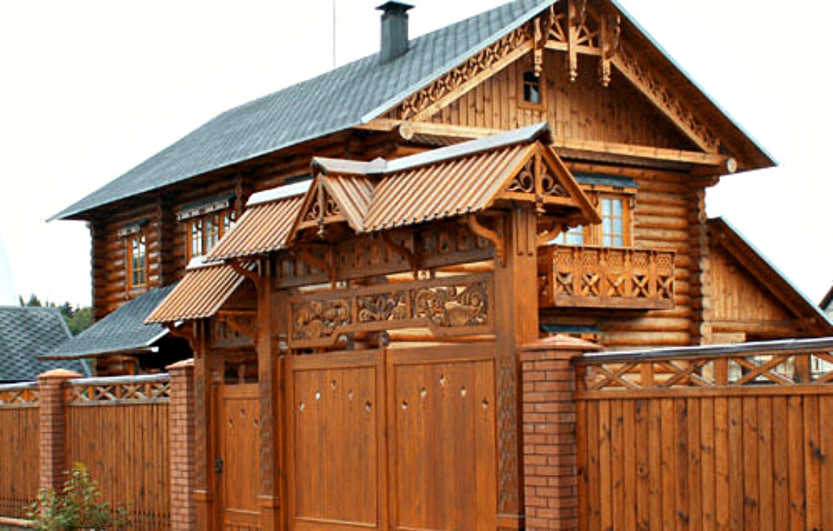 Деревянные полотна можно украсить различными орнаментами. Конструкции и дизайн ворот подбираются к любому стилю здания и ограждения.