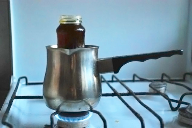 Для растапливания поместите емкость в миску с водой. Поставьте миску на плиту и включите средний огонь. Растапливайте комочки на водяной бане до тех пор, пока воск и обувной крем полностью не смешаются и не растворятся.