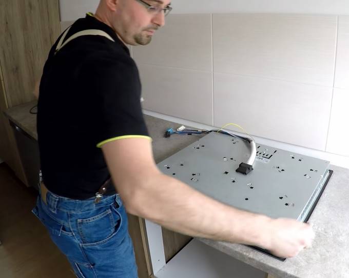 Далее оборудование требуется перевернуть и установить в столешницу. Этот процесс практически не отличается от монтажа газовой модели. Главное отличие – это не потребуется проводить работы по установке газового шланга и кранчика.