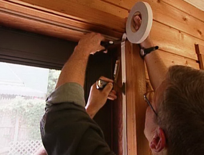 , изготовленная из поролона, – самый популярный и недорогой вид. К поролону крепится самоклеющаяся пленка, толщина ее может варьироваться. Способы крепления поролоновой ленты разные в зависимости от материала, из которого сделана дверная коробка. Если она деревянная, поролон фиксируется на ней обойными гвоздями, а если входная конструкция металлическая, можно использовать прочный клей, который годится для того, чтобы с его помощью работать с металлом. Из минусов ленты из поролона следует отметить то, что она не отличается износостойкостью и ее хватает ненадолго. Также поролон вследствие своей пористости (особенно если речь идет о лентах большой ширины) имеет свойство пропускать холодный воздух, поэтому лучше всего использовать его в качестве утеплителя не входных, а межкомнатных дверей.