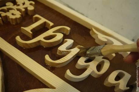После этого пройдитесь по вырезанной поверхности наждачной бумагой, чтобы убрать все огрехи. Затем кистью нанесите морилку. На всё изделие хватит одного слоя жидкости, а в углублениях пройдитесь в 2–3 слоя, чтобы затенить их и добавить дополнительный объем буквам и узорам. В финале работы вскройте изделие лаком и дайте ему высохнуть в течение 10–12 часов.