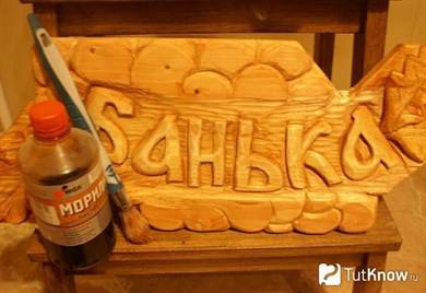 Окончательно,табличка для бани покрывается лаком.Лак придает древесине водонепроницаемость,что будет важно,если табличку повесить над входной дверью бани снаружи.