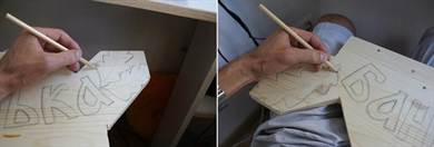 После вырезания внутрь поверхности надписи резцом-косячком получился оригинальный шрифт, который выжигателем “стайером” выжигается как карандашом.