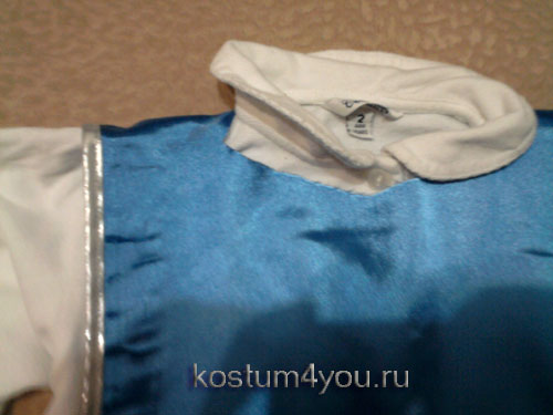 . Вырежьте из голубого атласа два прямоугольника. Для первого прямоугольника нужно измерить ширину плеч и длину от плеча до бедер ребенка. Ширина плеч — ширина прямоугольника, удвоенная длина от плеча до бедер — длина прямоугольника. Второй прямоугольник — рукава накидки, которые будут на 6 см меньше в ширину и на 6 см короче в длину. Второй прямоугольник разрезается пополам. Пришейте к краю первого прямоугольника золотую ленту, сложите его пополам и вырежьте горловину. Сделайте сзади надрез и наденьте на ребенка — горловина накидки должна проходить свободно. Пришейте молнию сзади. Обработайте горловину золотой лентой.