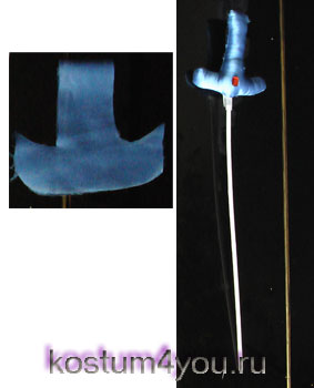 . Рукоятку шпаги можно выкроить из той же ткани, которую вы использовали для плаща. Сделайте две детали, сложите их лицевой стороной друг к другу и сшейте, оставив небольшое отверстие. Выверните рукоятку, набейте ее любым наполнителем, в отверстие вставьте пластмассовую палочку от воздушного шарика. Рукоятку можно украсить бисером, стразами и т. п.