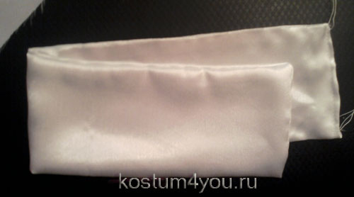 . Вырежьте из белого атласа прямоугольник. Полученный прямоугольник сложите, прострочите с трех сторон, выверните и прогладьте. Необработанный край (около 0,5 см) загладьте и опять прострочите. Сверху пришейте кружево. Воротник пришейте к белой рубашке или белой водолазке. - Накидка