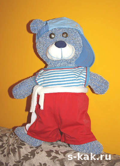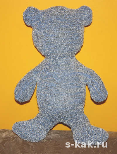 - Голову, туловище и лапки соединяют при помощи потайного шва. В двух — трёх местах пришивают декоративные заплатки голубого цвета.
