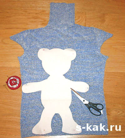 Распечатывают или рисуют выкройку медведя. Шаблон вырезают и переносят на свёрнутую пополам ткань. Ткань фиксируют булавками и вырезают. Детали можно сшивать двумя способами: