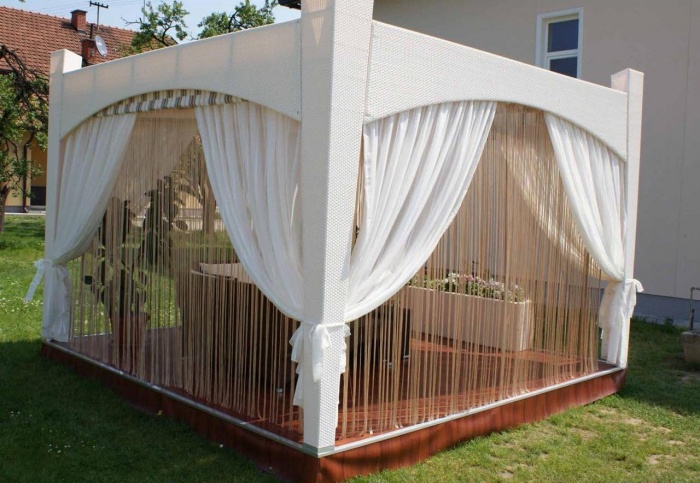 Можно выбрать любой дизайн тента, который будет хорошо сочетаться с основным строением и ландшафтным дизайном. При необходимости материал меняют, что не отнимает много времени и сил. Стандартный срок службы тента составляет 5 лет. Показатель зависит от условий, в которых используется тент, как часто его натягивают на каркас и демонтируют.