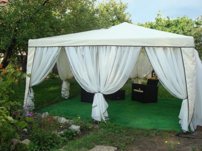 Мобильный навес берут с собой не только на дачу, но и при выезде на природу. Конструкция может состоять только из крыши или иметь стенки из мягкого материала. Иногда вместо ткани в комплект входят полимерные панели. Но тент практичнее, потому что материал легко снять, сложить на хранение. Он легче, занимает мало места.