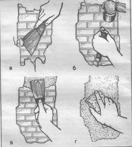 Как только раствор перестал липнуть к пальцам, необходимо из оштукатуренной стены изъять маяки. Для этого их достаточно подковырнуть с помощью шпателя в нескольких местах. Остатки гипса на стене аккуратно сбить острым концом молотка. Оставшиеся от маяков канавки заштукатуриваем.